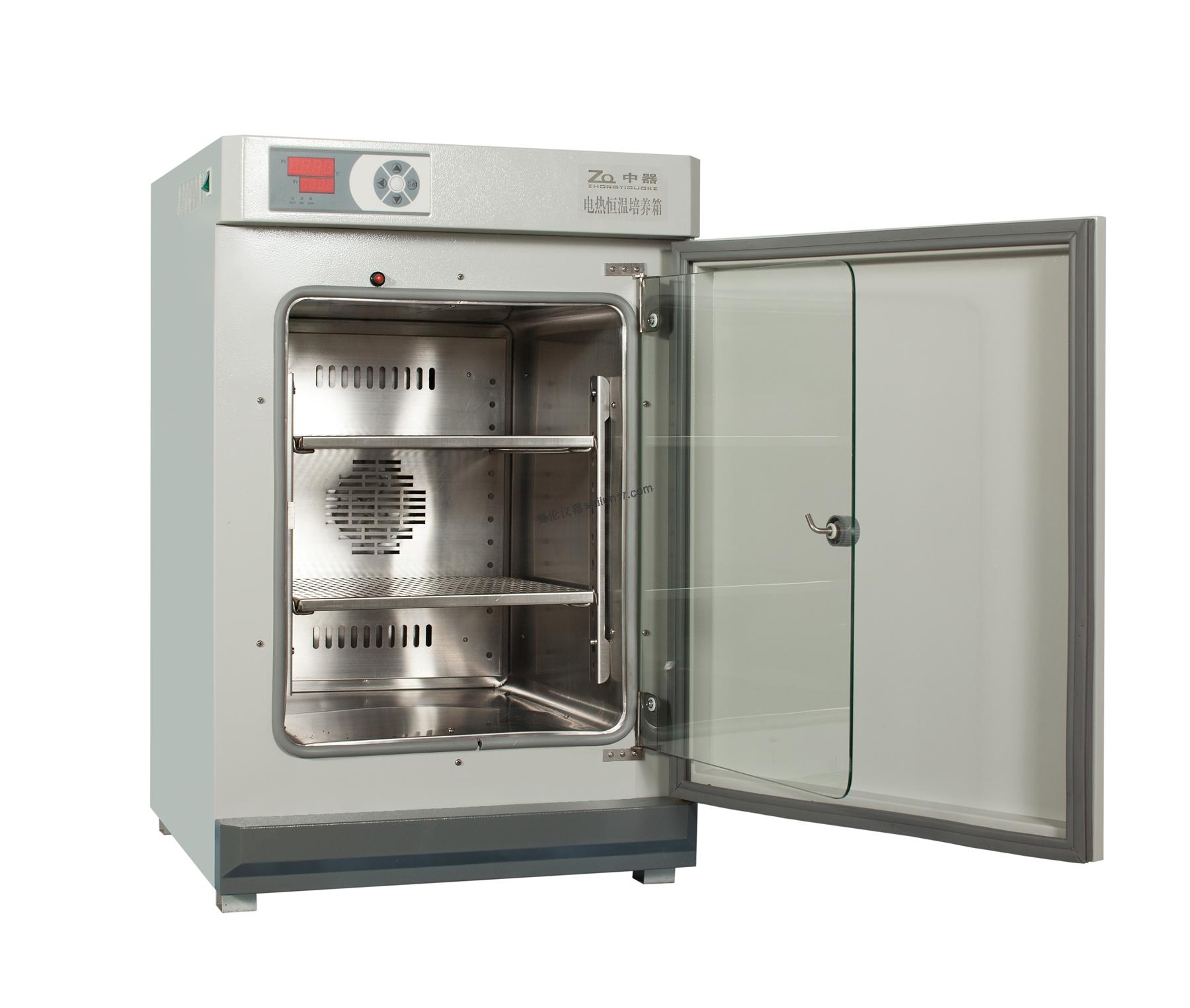 供大专院校、生物。农业。科研等部门做储蓄菌种,生物培养,进行科研的设备。1. 微电脑控温控制器。(可选智能型液晶程序温度控制器)2. 外门内层有一层玻璃门,观察方便明了。箱门打开时,微风循环加热自动停止,无过冲之弊。3. 优质不锈钢内胆,电热膜加热方式,加热速度快。4. 具有4-20mA标准电流信号,RS485接口连接记录仪和计算机,能记录温度参数的变化状况。(选配)5. 操作简单,无需PID等相关参数设定。6. 温度自适应控制,无需长时间的自整定过程7. 根据环境温度、负载量的大小自动调节控制参数,控温精度高。8. 箱体开门后无积分项累积,再关门后温度过冲小。DHP-9162恒温培养箱参数: